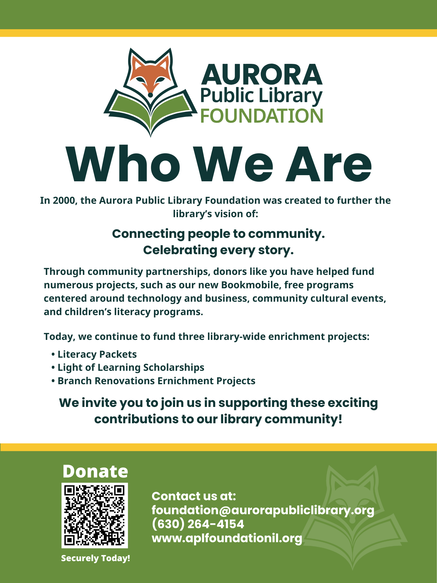 | Questions: Please call 630-264-4154oremail foundation@aurorapubliclibrary.org |